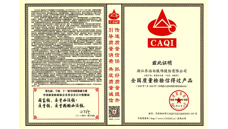 喬治白先后榮獲中國名牌產(chǎn)品、中國職業(yè)裝十大領(lǐng)軍企業(yè)、全國守合同重信用單位、國家級綠色工廠、浙江省智能工廠等榮譽(yù)稱號。作為全國標(biāo)準(zhǔn)化工作先進(jìn)單位,喬治白積極參與標(biāo)準(zhǔn)化工作,先后參與《職業(yè)裝檢驗(yàn)規(guī)則》、《襯衫》、《女西服、大衣》等9項(xiàng)國家標(biāo)準(zhǔn)的起草與修訂工作,《全毛襯西服》行業(yè)標(biāo)準(zhǔn)起草。