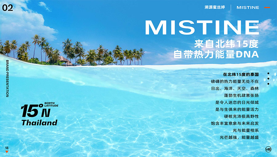 MISTINE蜜絲婷1988年始源于泰國(guó),作為知名國(guó)際美妝品牌,擁有超過(guò)35年的科研底蘊(yùn),產(chǎn)品種類涵蓋防曬、美妝、護(hù)膚、香水、個(gè)護(hù)五大類,擁有近6000多個(gè)單品暢銷全球20多個(gè)國(guó)家,專注為全球女性提供豐富、安全、高品質(zhì)的美妝產(chǎn)品。自2016年進(jìn)入中國(guó)后,MISTINE蜜絲婷以“熱帶青春能量美妝”為品牌定位,為年輕人打造更懂得他們的全新美妝產(chǎn)品,并傳遞獨(dú)特的健康活力生活方式。