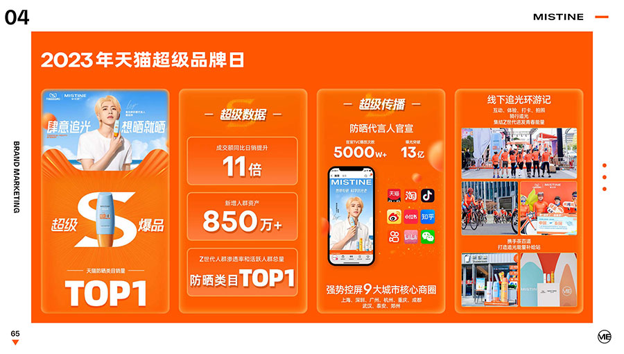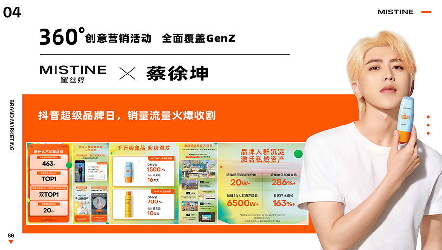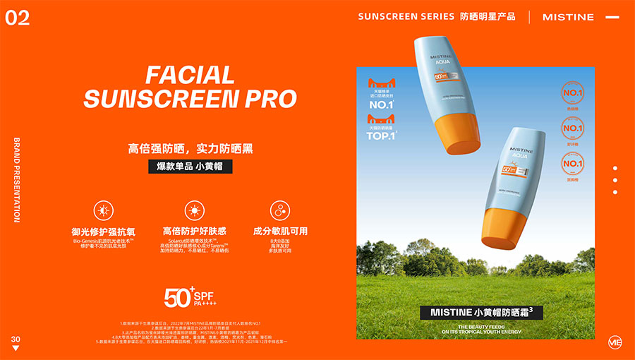 MISTINE蜜絲婷提出皮膚科學(xué)、前沿科技、靈魂成分、熱帶美學(xué)、卓越功效、保護(hù)環(huán)境六大品牌價(jià)值,致力于為全球女性提供豐富、安全、高品質(zhì)的美妝產(chǎn)品?;贛ISTINE蜜絲婷品牌首席科學(xué)顧問(wèn)——全球計(jì)算生物學(xué)權(quán)威之一、諾貝爾化學(xué)獎(jiǎng)得主Arieh Warshel的研究,MISTINE蜜絲婷創(chuàng)新防曬品類推出「光生物學(xué)」防曬系統(tǒng),提出“外層防護(hù)、中層修護(hù)和底層抗損”防曬新理念,引領(lǐng)防曬從“表面防護(hù)”進(jìn)入“深度抗光老”新時(shí)代。同時(shí),MISTINE蜜絲婷還持續(xù)深耕專業(yè)彩妝市場(chǎng),以熱帶美學(xué)基因造就產(chǎn)品防水防汗、高倍耐曬、長(zhǎng)效持妝的優(yōu)勢(shì),圍繞消費(fèi)者需求打造多元化的產(chǎn)品矩陣,引領(lǐng)防曬、底妝賽道發(fā)展。