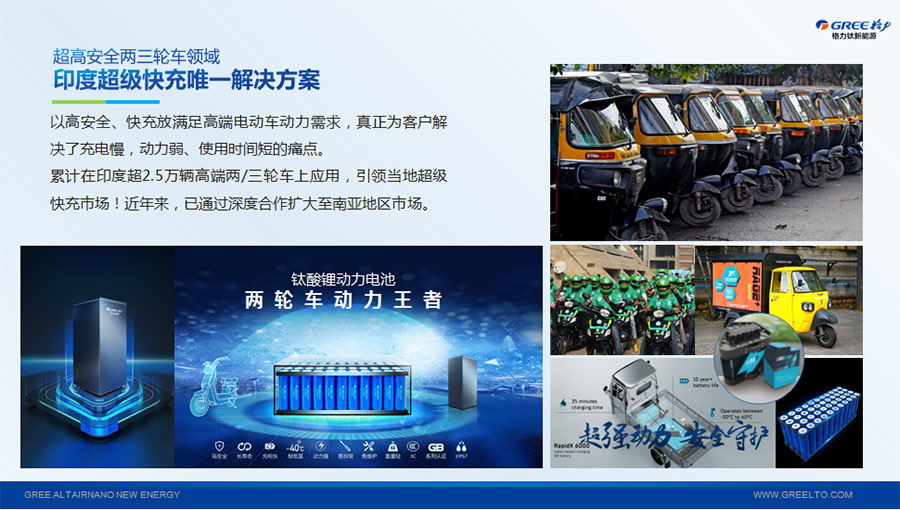 以完善的研發(fā)體系,格力鈦加快技術(shù)創(chuàng)新與產(chǎn)業(yè)升級(jí)的步伐。格力鈦研發(fā)的格力鈦電池安全性長(zhǎng)期領(lǐng)跑行業(yè),憑借具有高安全、大倍率、快充放、耐寬溫、長(zhǎng)壽命等特性,被選為“國(guó)家制造業(yè)單項(xiàng)冠軍產(chǎn)品”,廣泛應(yīng)用于新能源汽車以及工商業(yè)園區(qū)、通訊基站、電網(wǎng)調(diào)頻、軌道交通、風(fēng)光消納、船舶岸電、家庭住宅、軍事科研等儲(chǔ)能領(lǐng)域,具有廣闊的市場(chǎng)前景和應(yīng)用價(jià)值。目前,格力鈦儲(chǔ)能產(chǎn)品已在丹麥、瑞士、芬蘭等全球30多個(gè)國(guó)家和地區(qū)使用,新能源汽車產(chǎn)品在北京、杭州、武漢、成都、青島、哈爾濱、包頭、海口等全球240多座城市運(yùn)營(yíng),12年全球零電池事故安全運(yùn)行。