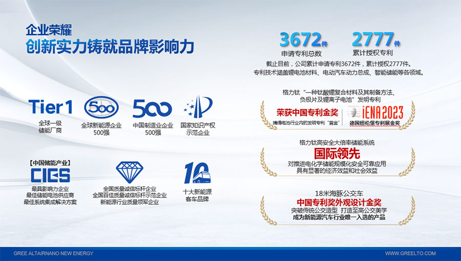 2022年,“一種鈦酸鋰復(fù)合材料及其制備方法、負(fù)極片及鋰離子電池”發(fā)明專利獲得中國(guó)專利金獎(jiǎng),摘得鋰電池行業(yè)內(nèi)的發(fā)明專利“首金”;2023年,該專利技術(shù)再次斬獲第75屆德國(guó)紐倫堡發(fā)明國(guó)際金獎(jiǎng)。“高安全大倍率儲(chǔ)能系統(tǒng)關(guān)鍵技術(shù)研發(fā)與應(yīng)用”項(xiàng)目被中國(guó)機(jī)械工業(yè)聯(lián)合會(huì)鑒定達(dá)到“國(guó)際領(lǐng)先”水平。截至目前,格力鈦先后獲得“中國(guó)民營(yíng)企業(yè)制造業(yè)500強(qiáng)”、“全國(guó)質(zhì)量信得過(guò)產(chǎn)品”、“客車安全技術(shù)成果獎(jiǎng)”、“中國(guó)儲(chǔ)能產(chǎn)業(yè)最具影響力企業(yè)獎(jiǎng)、最佳系統(tǒng)集成商、最佳儲(chǔ)能電池供應(yīng)商”等榮譽(yù),獲得工信部頒發(fā)的“綠色工廠”榮譽(yù)稱號(hào);上榜科技部發(fā)布的新能源領(lǐng)域獨(dú)角獸企業(yè),多年入選全球新能源企業(yè)500強(qiáng),入選“全國(guó)百佳質(zhì)量檢驗(yàn)誠(chéng)信標(biāo)桿企業(yè)”、“國(guó)家知識(shí)產(chǎn)權(quán)優(yōu)勢(shì)企業(yè)”等。