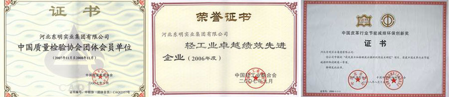 河北東明實業(yè)集團有限公司創(chuàng)建于1996年,集團下屬河北東明皮革有限公司、河北東明制衣有限公司、河北東明牛皮制革有限公司、東明金興制衣有限公司、東明酒店、東明商廈、河北東明中硅科技有限公司、辛集市東明房地產開發(fā)有限公司八個子公司。集團是按高標準、高起點、嚴要求興建的辛集地方特色產業(yè),經過幾年的不懈努力,已發(fā)展成擁有職工3000人,制革能力和產量在全國制革業(yè)中居前位,其中綿羊皮服裝革產銷量列第一位的中型民營企業(yè)。獲得國家星火計劃獎、國家農副產品加工龍頭企業(yè)、國家優(yōu)秀鄉(xiāng)鎮(zhèn)企業(yè)、全國外商投資先進企業(yè)、全國雙愛雙評先進企業(yè);獲河北省著名商標、河北省名牌、河北省質量效益型先進企業(yè)、河北省重合同守信用單位、河北省百強企業(yè)和石家莊市50強企業(yè)等80多個國家級獎項和榮譽稱號。集團在皮革行業(yè)樹立的良好聲譽使東明成為高品質的代名詞,可信賴的經營作風更獲得世界各地客戶贊賞!集團近年來不斷加大技改投入,先后投入3個億人民幣進行技術改造,投入2000萬進行環(huán)保污水處理,經過不斷的創(chuàng)新改造,在環(huán)境保護和環(huán)境治理上取得了可喜成就。其中,無灰浸鞣、廢灰夜循環(huán)利用、廢鉻液循環(huán)利用工藝技術,獲河北省科技廳科技成果獎,并在全國皮革行業(yè)推廣,取得豐厚的企業(yè)經濟效益和社會效益。2009年獲全國輕工行業(yè)“節(jié)能減排環(huán)保創(chuàng)新獎”。獲得全國“五一勞動獎狀”。河北東明實業(yè)集團有限公司產品質量獲得國家真皮生態(tài)皮革稱號、辛集市利稅大戶。近年來向社會捐資500萬用于公益事業(yè)?,F(xiàn)在集團勞動關系和諧,曾被國家評為“雙評雙愛”先進單位。多次被省評為“重合同守信用”企業(yè),客戶對產品質量滿意率一直在99%以上,客戶對產品售后服務滿意度在99%以上。集團成立以來致力于生產高質量的產品,“以誠信為根本,視質量為生命”是東明人一貫遵循的準則,也正是對這一目標的不懈追求使公司不斷的發(fā)展壯大。集團生產的綿羊服裝革,以其色澤均勻、手感柔軟著稱,不僅在國內有很高的聲譽,還贏得了國外許多廠家的青睞,已打入美國、加拿大、韓國、俄羅斯、香港等國外市場。