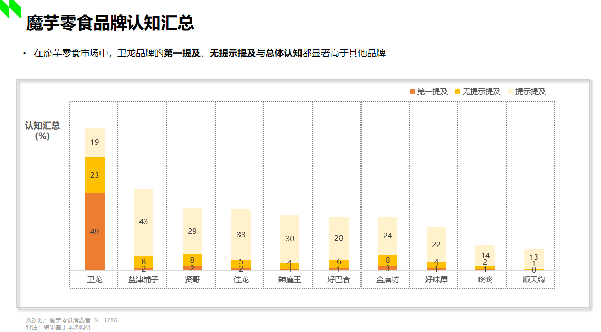 據2022年尼爾森調研顯示,在魔芋市場中,衛(wèi)龍品牌的第一提及、無提示提及與總體認知都顯著高于其他品牌。顯然,衛(wèi)龍發(fā)明的魔芋爽在市場中已然奠定了良好且堅固的受眾認知基礎,那么“小魔女”的加入,不僅進一步充實了衛(wèi)龍自身的產品矩陣,占位了“魔芋素毛肚”的產品類目,也將引領魔芋休閑食品賽道邁向更高品質的發(fā)展方向,為市場打開全新的增量機遇。