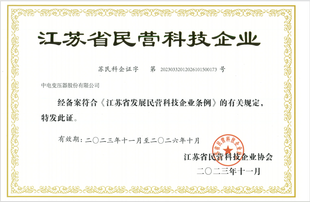 中電變壓器股份有限公司憑借突出的技術(shù)創(chuàng)新成績和強大實力榮列其中,榮獲“江蘇省民營科技企業(yè)”稱號!