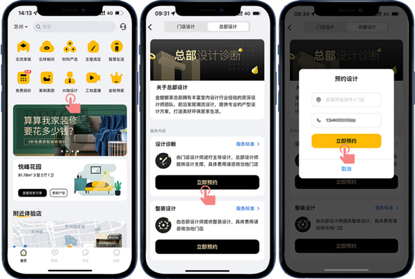 打開金螳螂家APP,進入首頁“大咖設計”,可了解設計師的個人簡介,以及他的優(yōu)秀裝修作品和客戶的真實評價,通過以上了解,客戶挑選中意的設計師,馬上預約,就可與他線上直接暢聊溝通設計方案、設計細節(jié),為客戶量身定制專屬方案。