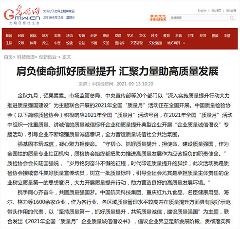 光明網(wǎng):肩負(fù)使命抓好質(zhì)量提升 匯聚力量助高質(zhì)量發(fā)展——中國質(zhì)量檢驗(yàn)協(xié)會(huì)組織開展2021年全國“質(zhì)量月”企業(yè)質(zhì)量誠信倡議專題活動(dòng)