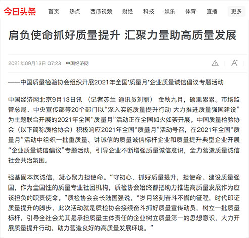 中國經(jīng)濟(jì)網(wǎng):堅(jiān)持質(zhì)量第一 抓好質(zhì)量提升 共筑質(zhì)量誠信 建設(shè)質(zhì)量強(qiáng)國——2021年全國“質(zhì)量月”企業(yè)質(zhì)量誠信倡議書