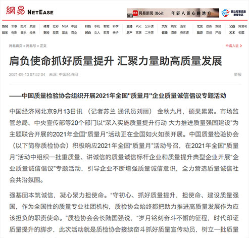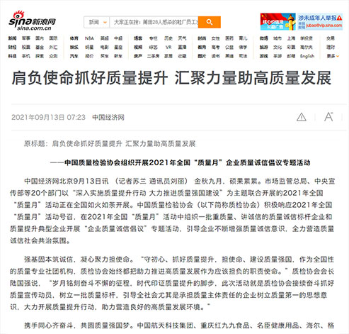 搜狐網(wǎng):肩負(fù)使命抓好質(zhì)量提升 匯聚力量助高質(zhì)量發(fā)展——中國質(zhì)量檢驗(yàn)協(xié)會(huì)組織開展2021年全國“質(zhì)量月”企業(yè)質(zhì)量誠信倡議專題活動(dòng)
