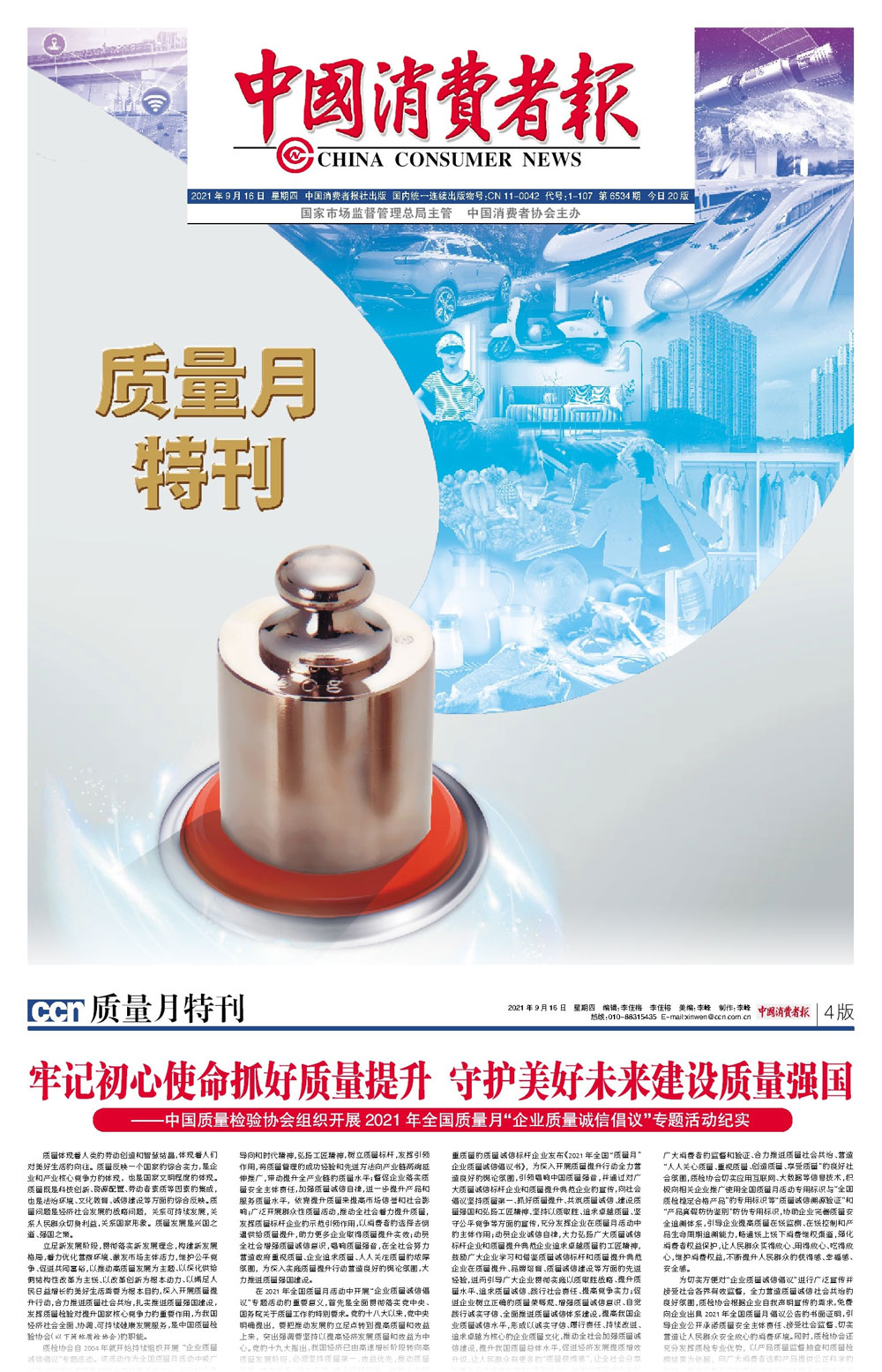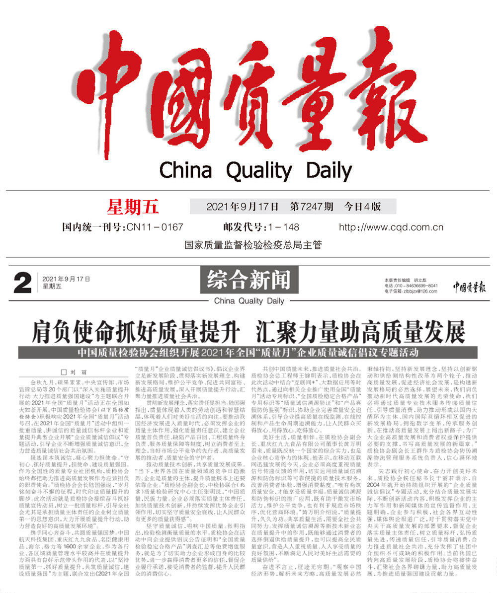 中國質(zhì)量報(bào):肩負(fù)使命抓好質(zhì)量提升匯聚力量助高質(zhì)量發(fā)展——中國質(zhì)量檢驗(yàn)協(xié)會(huì)組織開展2021年全國“質(zhì)量月”企業(yè)質(zhì)量誠信倡議專題活動(dòng)